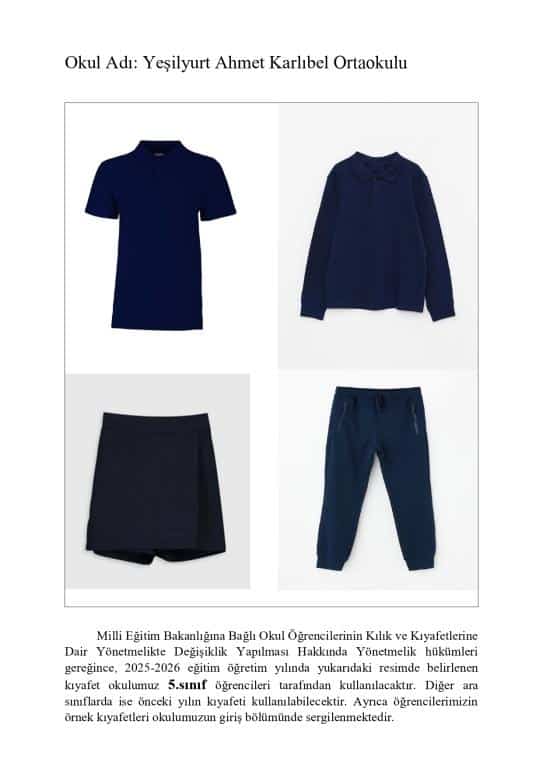 Okul Kıyafetimizin bütün parçaları LACİVERT renktedir.